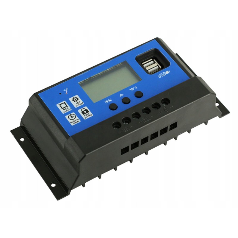 Przetwarza energię dostarczaną z paneli do akumulatora, jednocześnie zabezpiecza przed przeładowaniem akumulatorów oraz nadmiernym rozładowaniem przez odbiorniki podłączone do regulatora.