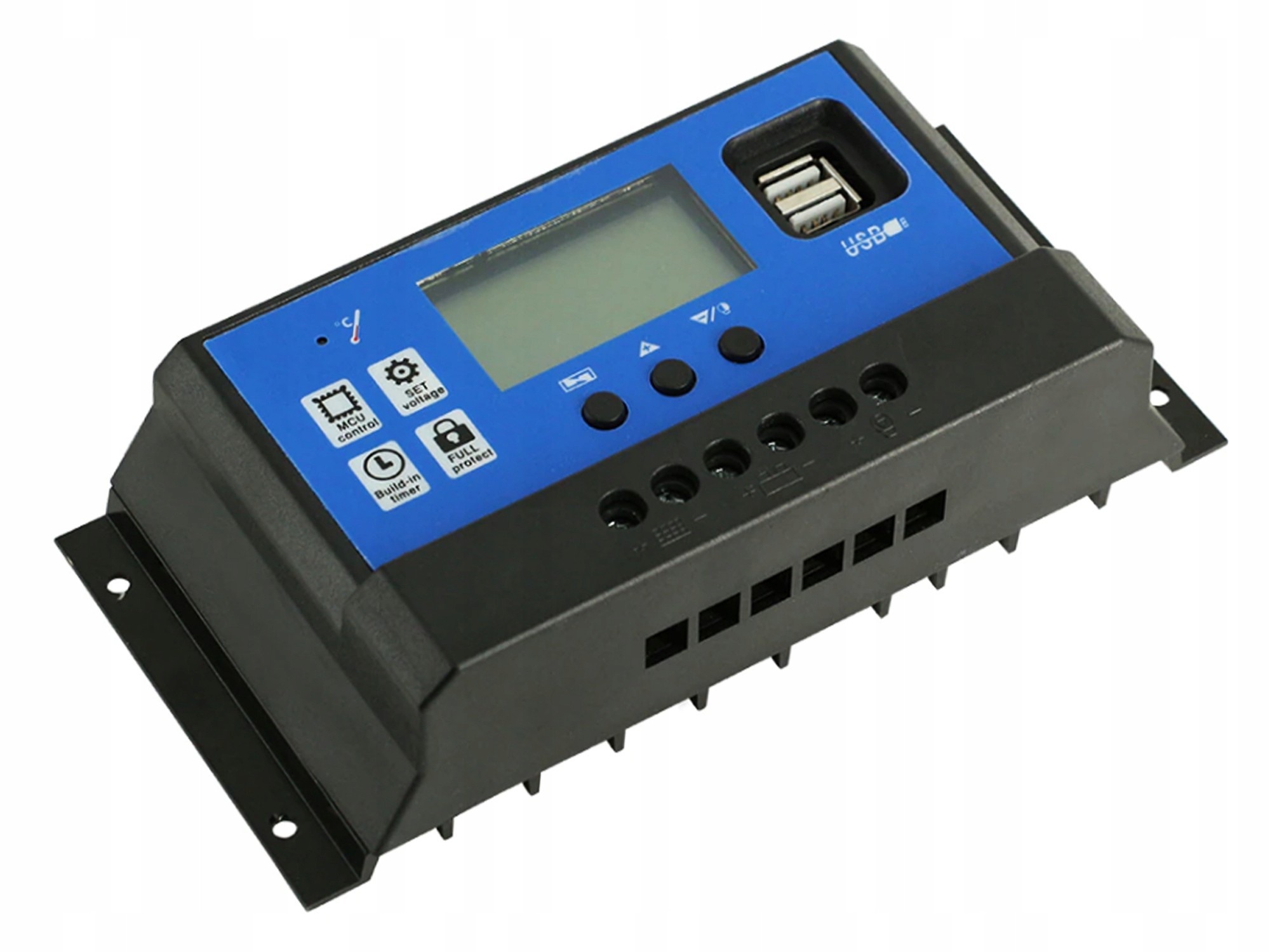 Regulator solarny i kontroler ładowania do paneli fotowoltaicznych 12/24V z wyświetlaczem LCD i portami USB.