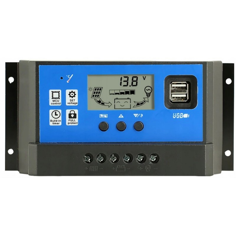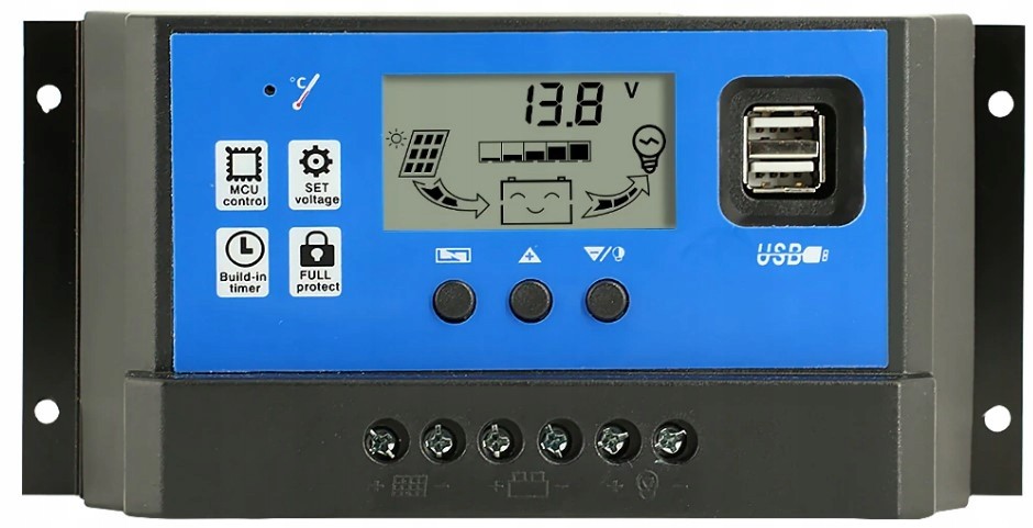 Regulator solarny i kontroler ładowania do paneli fotowoltaicznych 12/24V z wyświetlaczem LCD i portami USB.