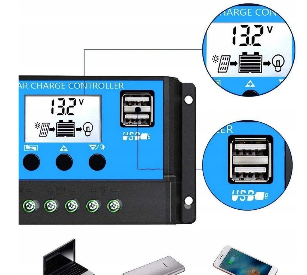 Regulator solarny i kontroler ładowania do paneli fotowoltaicznych 12/24V z wyświetlaczem LCD i portami USB.