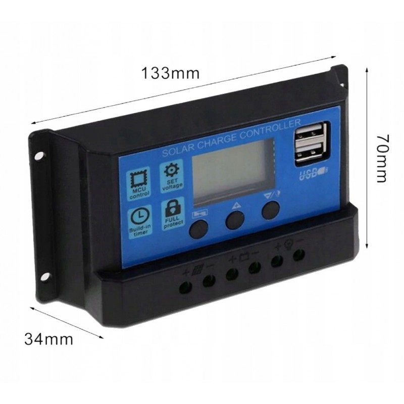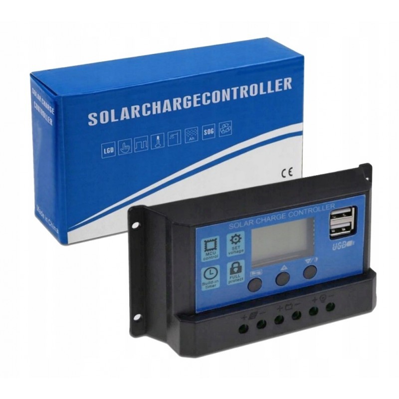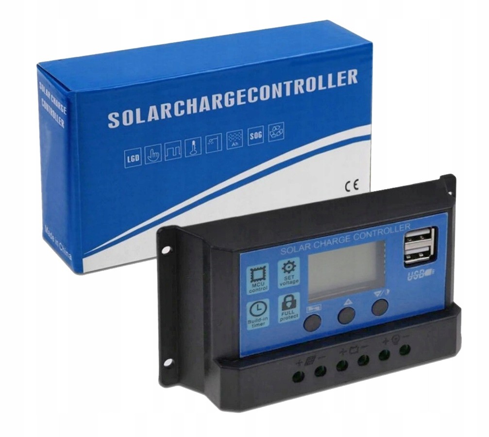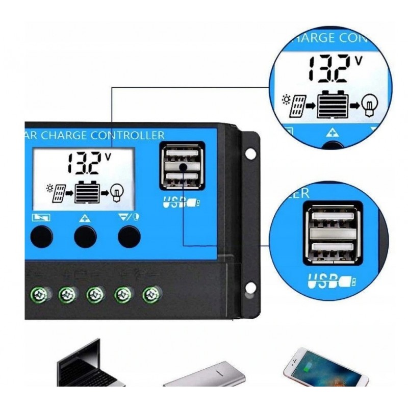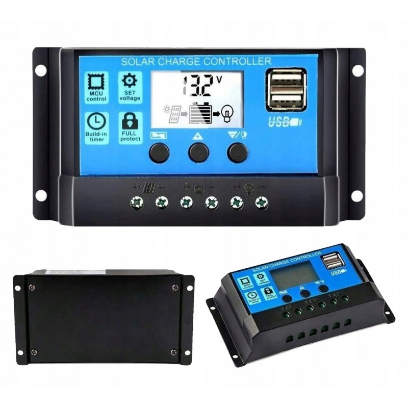 Regulator solarny i kontroler ładowania do paneli fotowoltaicznych 12/24V z wyświetlaczem LCD i portami USB.