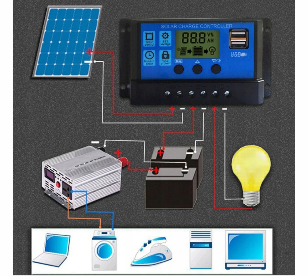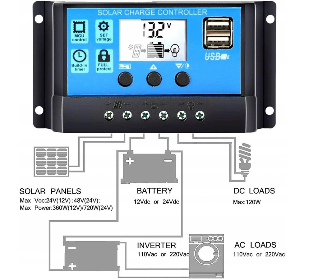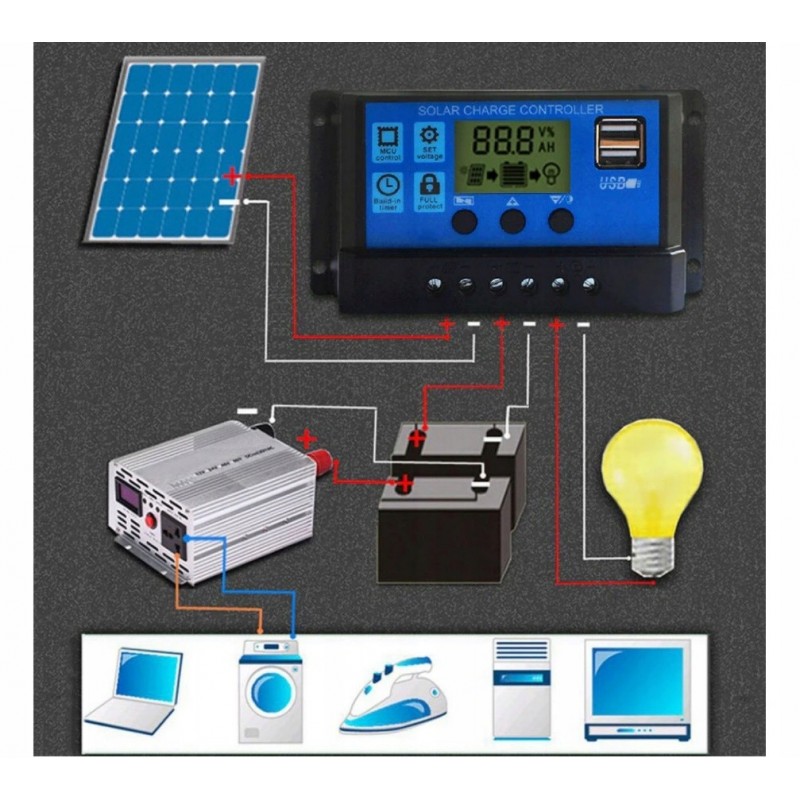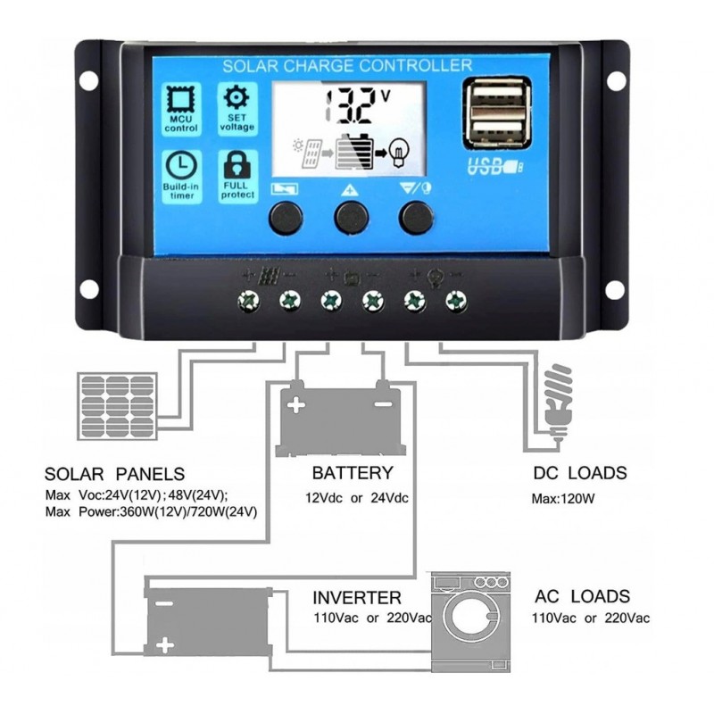 Przetwarza energię dostarczaną z paneli do akumulatora, jednocześnie zabezpiecza przed przeładowaniem akumulatorów oraz nadmiernym rozładowaniem przez odbiorniki podłączone do regulatora.