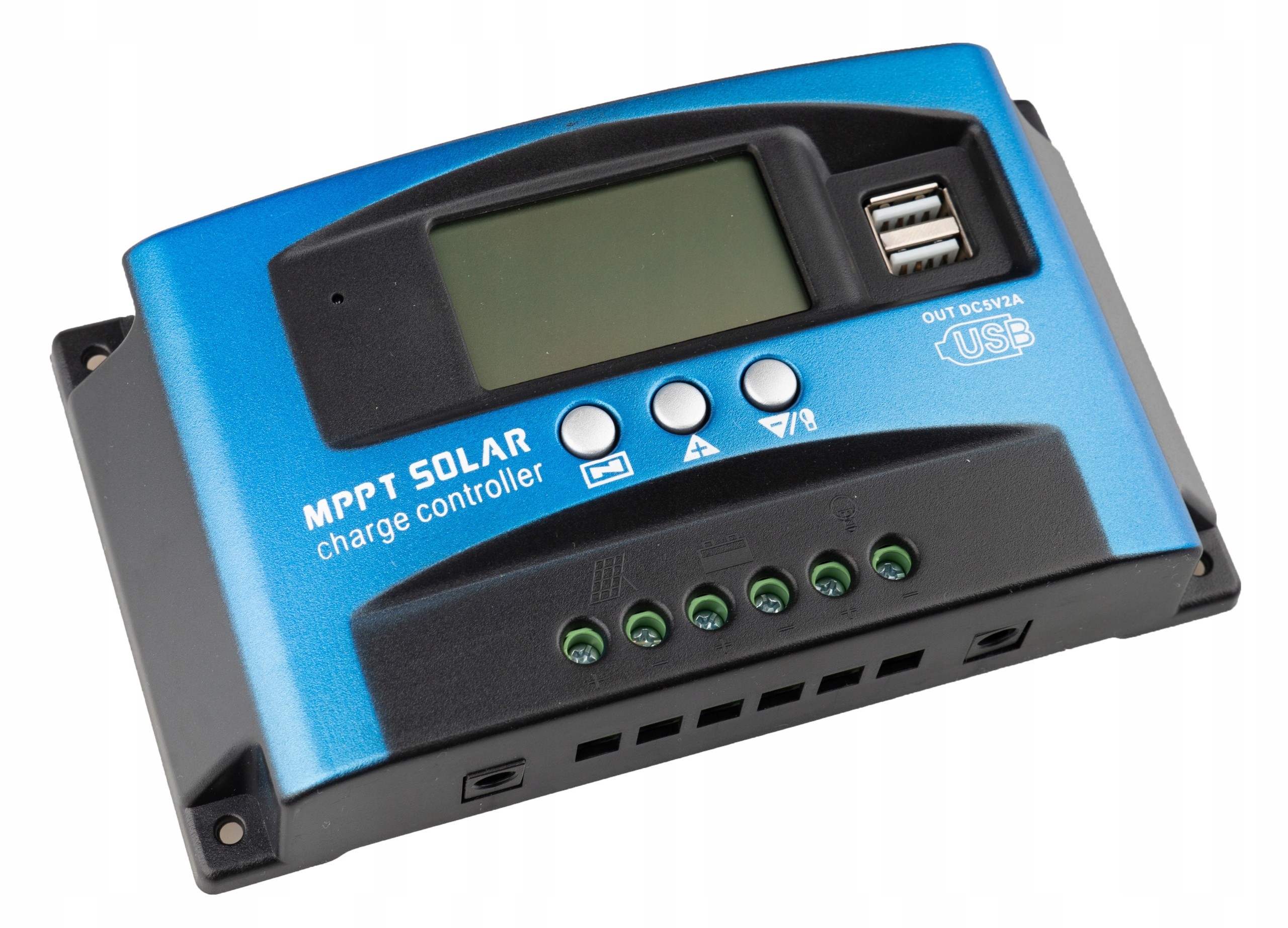 Regulator solarny i kontroler ładowania do paneli fotowoltaicznych 12/24V z wyświetlaczem LCD i portami USB.