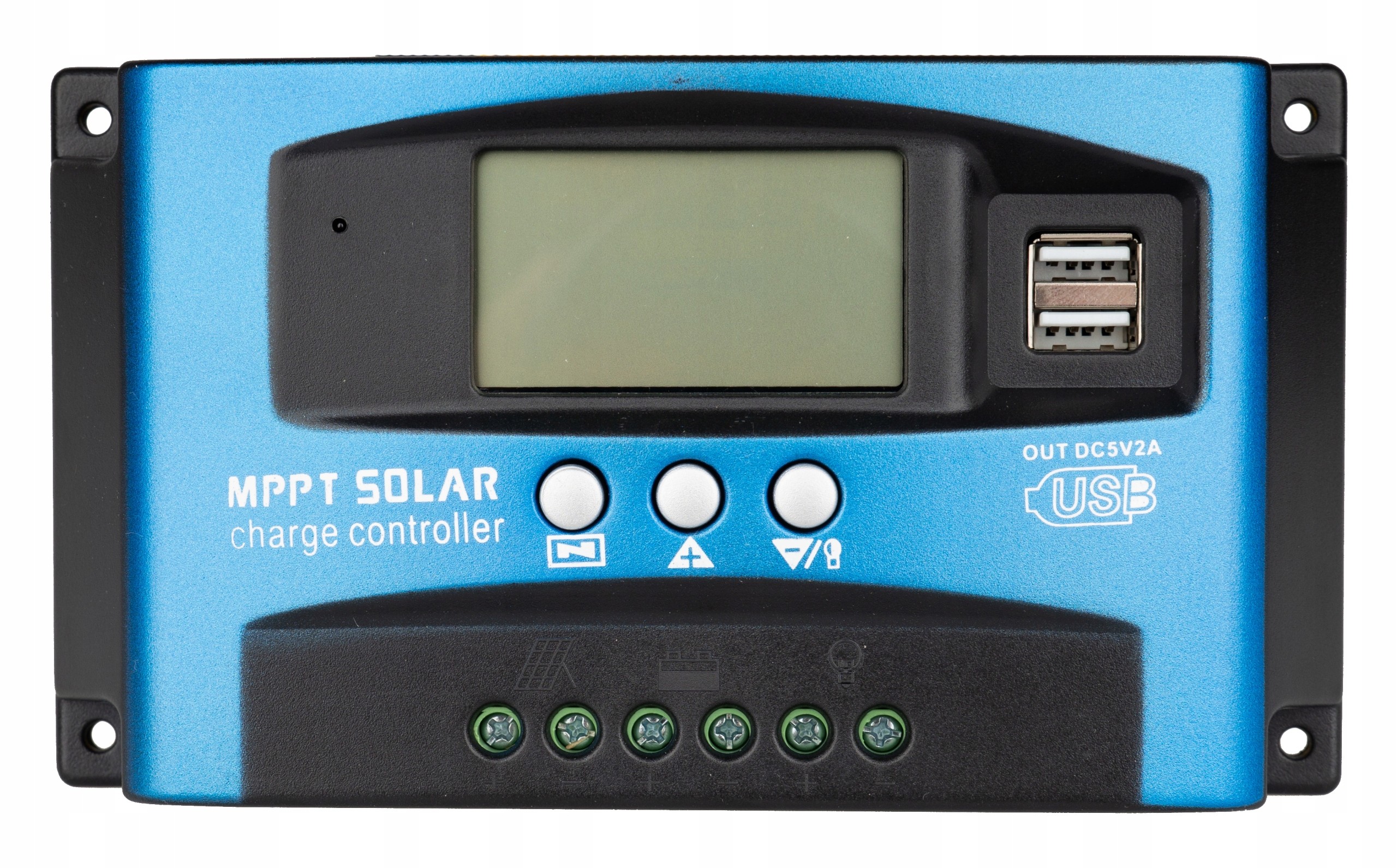 Solarny regulator i kontroler ładowania MPPT do paneli fotowoltaicznych 12/24V z wyświetlaczem LCD i dwoma portami USB.