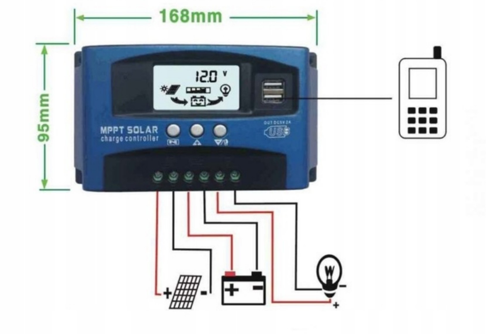 Przetwarza energię dostarczaną z paneli do akumulatora, jednocześnie zabezpiecza przed przeładowaniem akumulatorów oraz nadmiernym rozładowaniem przez odbiorniki podłączone do regulatora.