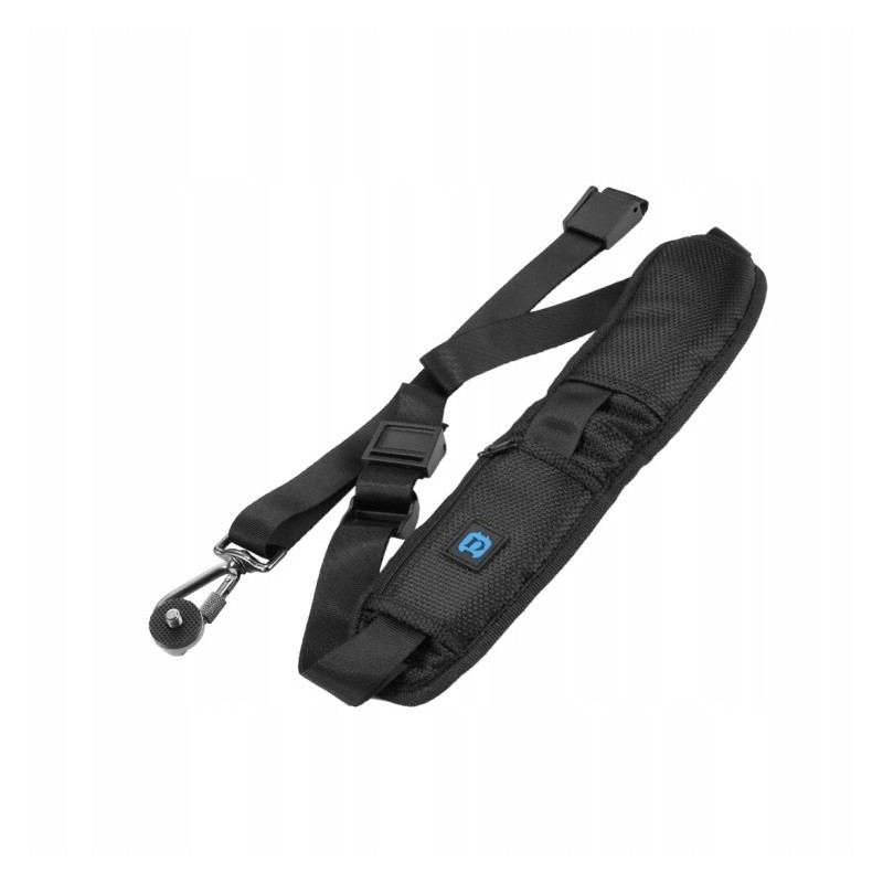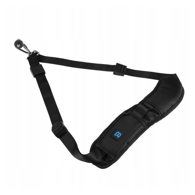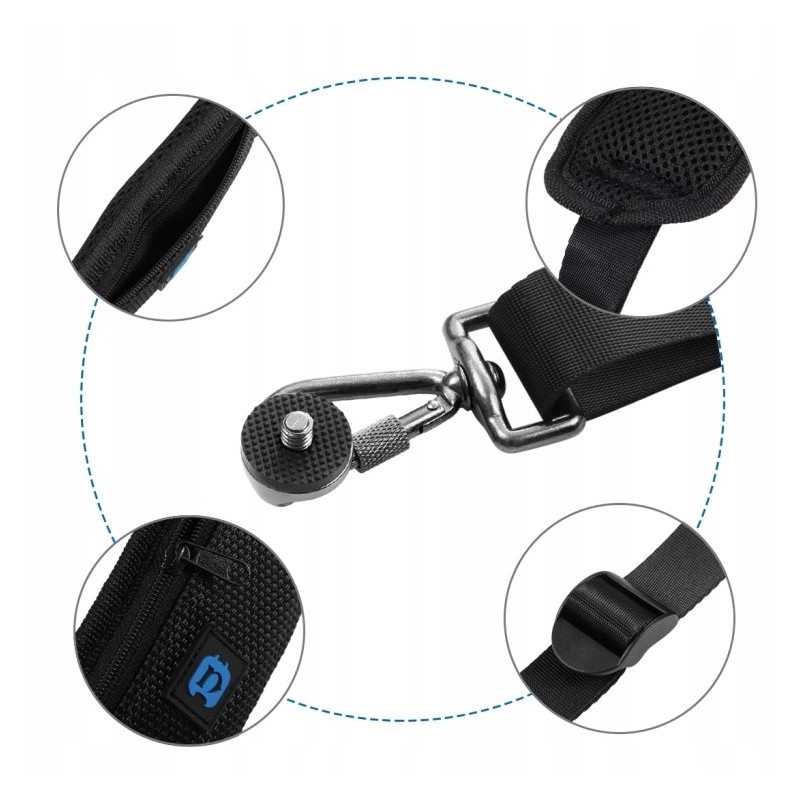 Pasek posiada wytrzymały, wzmocniony metalowy haczyk z blokadą śrubową oraz nierdzewną śrubę z gumową warstwą, które bezpiecznie mocują ciężki aparat.