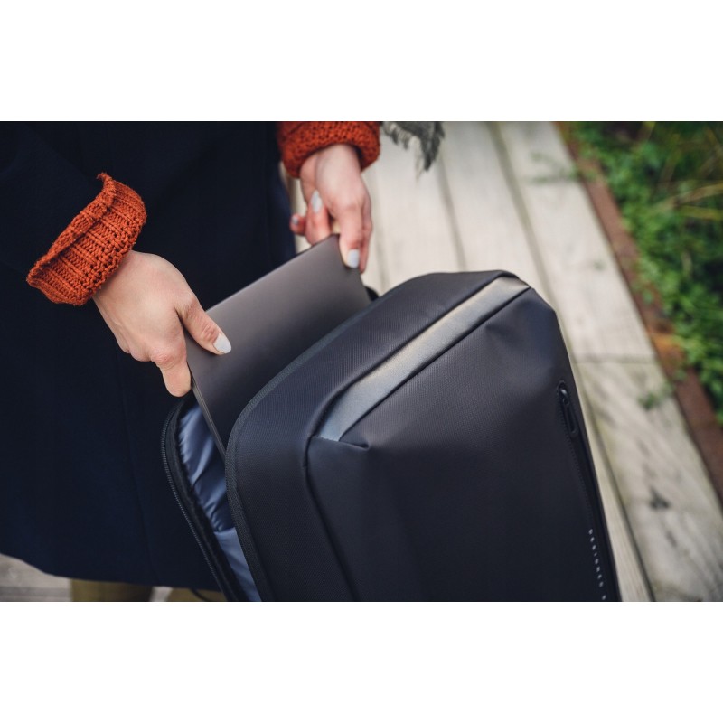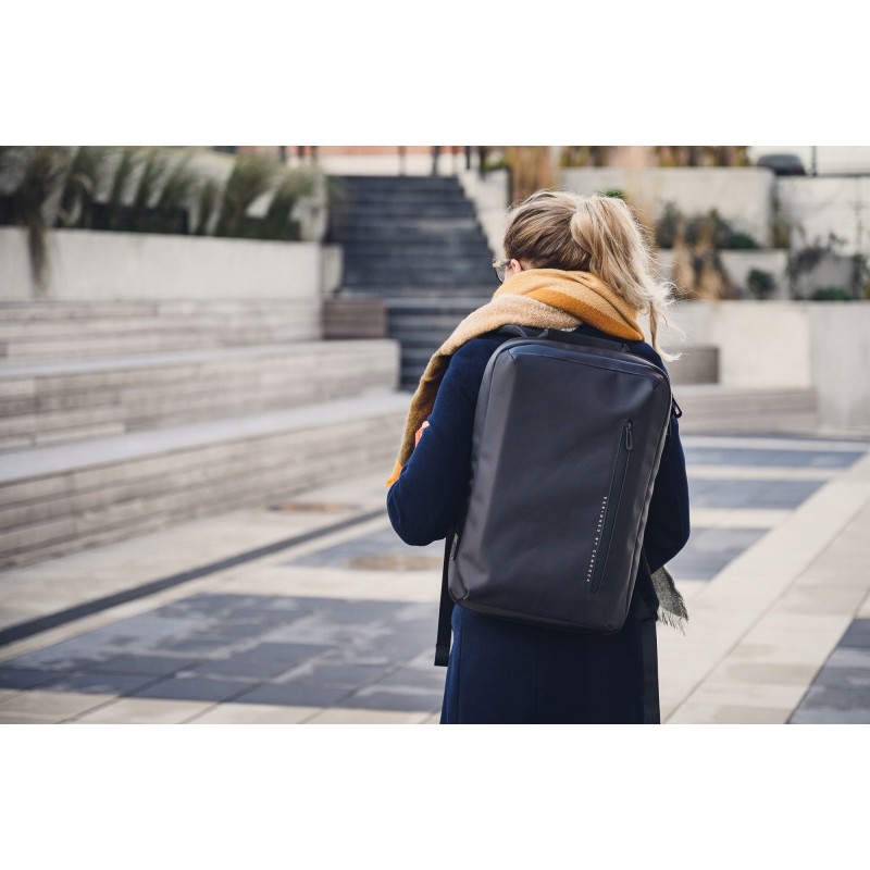 Plecak waży jedynie 840 g, jest niezwykle smukły i elegancki. Jego design świetnie sprawdzi się w połączeniu z bardziej formalnym strojem biznesowym w trakcie podróży służbowych. Nowoczesny wygląd doskonale wkomponuje się w klimat dużego miasta.