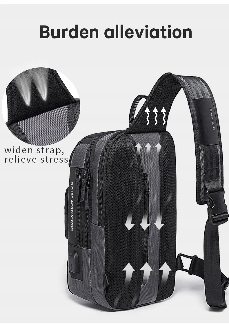 Plecak BANGE posiada wbudowany, zewnętrzny port USB.