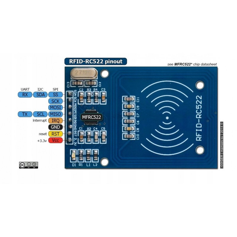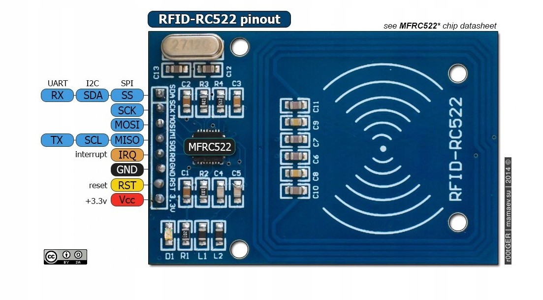 Moduł oparty jest na układzie RC522. Komunikacja odbywa się przez SPI, a napięcie zasilania wnosi 3,3V.