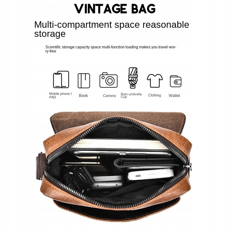 Piękna torba-listonoszka męska utrzymana jest w modnym i ponadczasowym stylu vintage, świetnie wpisującym się w stylizacje miejskie.